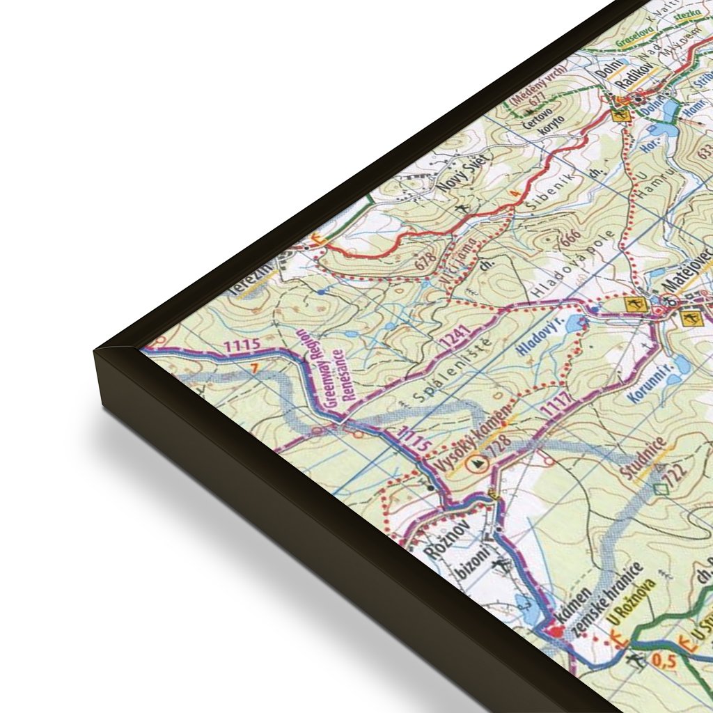 Mapy se vyrábí ze skládaných turistických map, tepelná laminace přehyby vyrovná. Mapu opatříme lištami pro snadné zavěšení, případně mapu zarámujeme do Vámi vybraného rámu. Laminovaná mapa je odolná vůči poškození, lze ji popisovat suchým fixem a vydrží několik let i ve venkovních podmínkách.